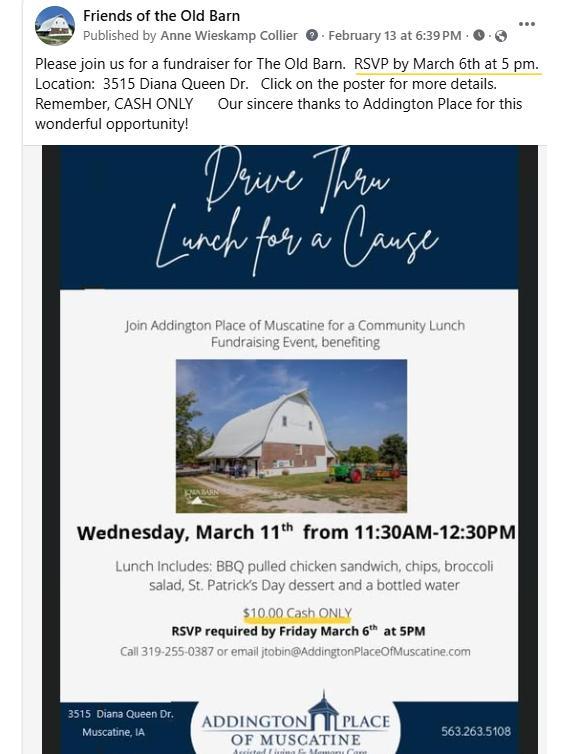 Please join us for a drive thru lunch fundraiser for The Old Barn. RSVP by March 6th at 5 pm. Location: 3515 Diana Queen Dr. Click on the poster for more details. Remember, CASH ONLY Our sincere thanks to Addington Place for this wonderful opportunity