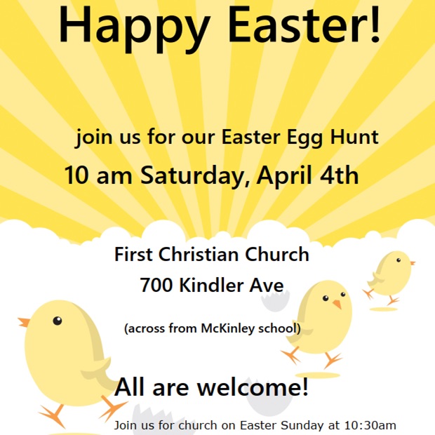 Easter Egg Hunt, Saturday, April 4th at 10 a.m. First Christian Church, 700 Kindler, Muscatine, IA. All are welcome.