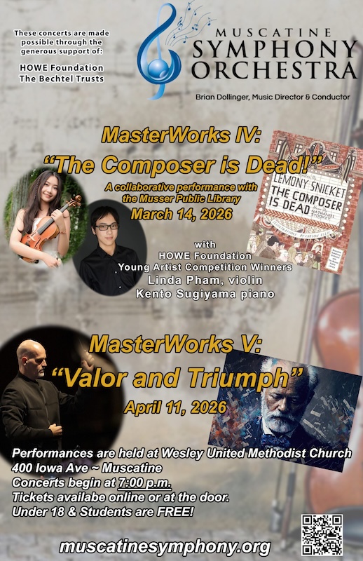 All concerts are at Wesley United Methodist Church at 7:00 pm. Tickets available on the website: muscatinesymphony.org