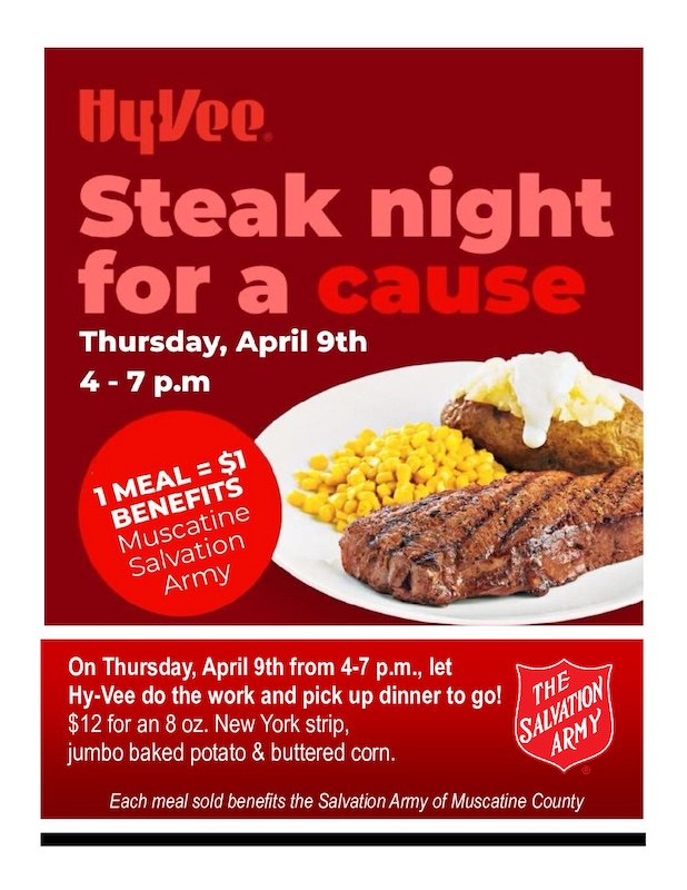 Come out and enjoy an 8 oz New York strip, jumbo baked potato and buttered corn all for $12! $1 from each meal goes back towards your Muscatine Salvation Army.