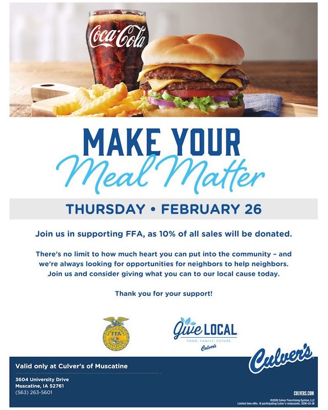 Head over to Culver’s of Muscatine on Thursday, February 26 and help support the local FFA chapter. Culver’s will be donating 10% of ALL sales that day to the Muscatine FFA — so every meal you enjoy goes toward a great cause.