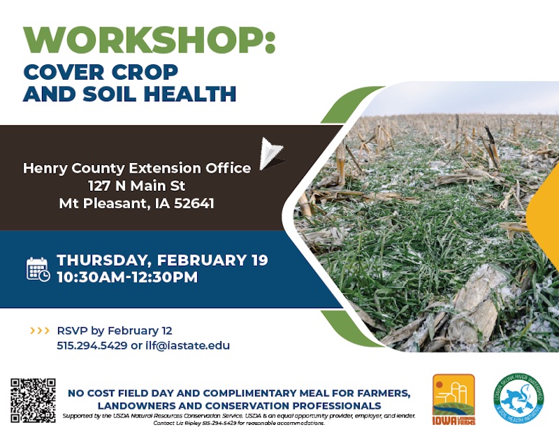 Iowa Learning Farms, in partnership with Lower Skunk River WQI Project and Pathfinders RC&D, will host a cover crop workshop in Mt. Pleasant on Thursday, Feb. 19, from 10:30 a.m. to 12:30 p.m. at the Henry County ISU Extension Office. The event is open to farmers and landowners at no cost and includes a complimentary meal.