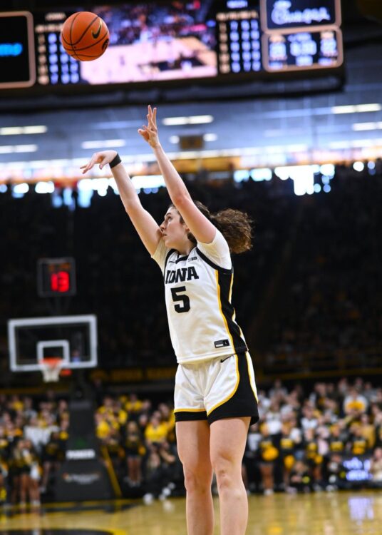 In the second half Heiden scored 20 of her 24 points in the second half adding 10 rebounds, two blocks and two steals. Senior Hannah Stuelke had her own double-double on the day with 11 points, 12 rebounds and seven assists.  Heiden scored Iowa’s first three baskets of the third quarter and brought down four rebounds. The Hawkeyes fought through a defensive battle forcing three more Michigan turnovers. Senior Kylie Feuerbach drained a crucial three-point basket at the buzzer as the quarter ended, up 42-35.