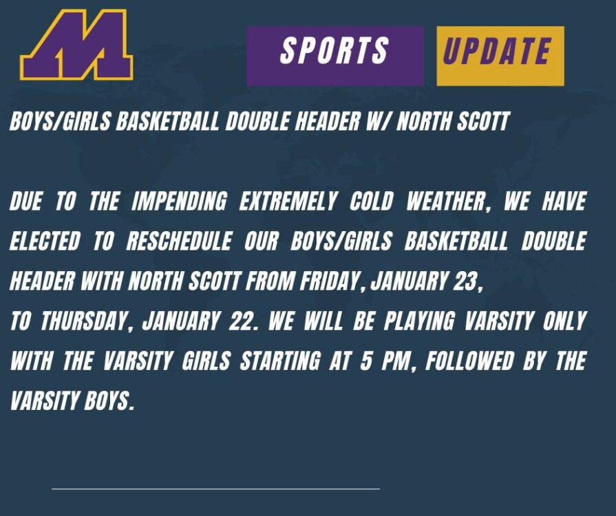 “Due to the impending extremely cold weather, we have elected to reschedule our boys/girls basketball double header with North Scott from Friday, January 23, to Thursday, January 22. We will be playing varsity only with the varsity girls starting at 5 pm, followed by the varsity boys.”