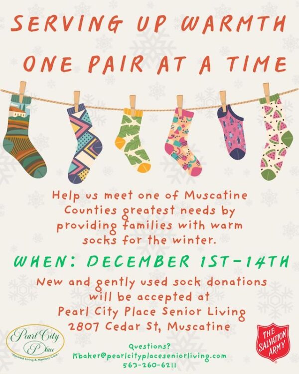 From Dec. 1–14, residents and neighbors are invited to drop off new or gently used socks at Pearl City Place’s facility, located at 2807 Cedar St., for families in need throughout Muscatine County.